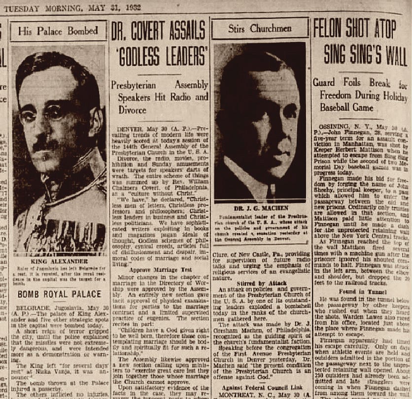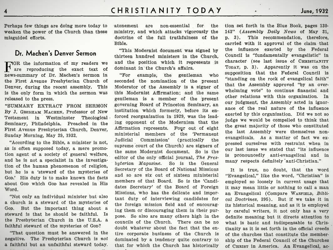 Major ecclesial figures sometimes called press conferences in 1932…and reporters even came. Sermon summaries were provided to the papers, and we have a friendlier and fuller picture from a publication with which Machen was associated—the “old” Christianity Today (as referenced in the above quote):